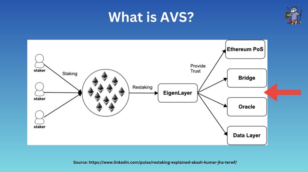 AVS 即主动验证服务,指的是任何需要自身验证系统的网络,如预言机、跨链桥等。在本文中,AVS 可理解为使用再质押服务的项目。
