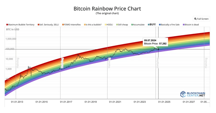 彩虹图是比特币的长期估值工具,使用对数增长曲线来预测比特币潜在的未来价格方向。上方较暖的颜色显示市场何时可能过热,是较好的卖出点;较冷的颜色时表示整体市场情绪通常会低迷,是比较好的买入点。
