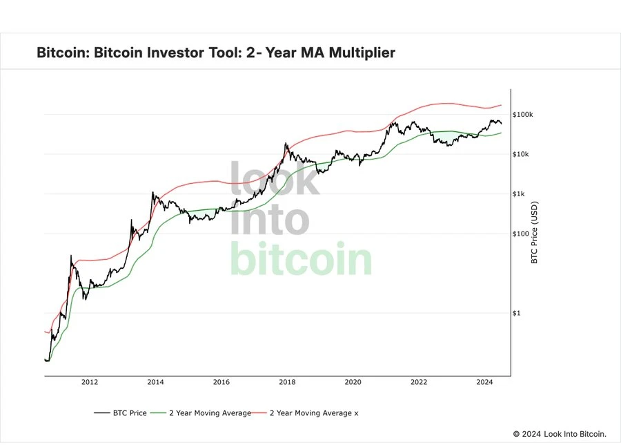 两年均线乘数指标,使用了两年移动平均值线 2 Year Moving Average(等价 730 日线,绿色线),以及该移动平均值线的 5 倍乘积(红色线),突出显示了在哪些时期买卖比特币会产生巨大回报。