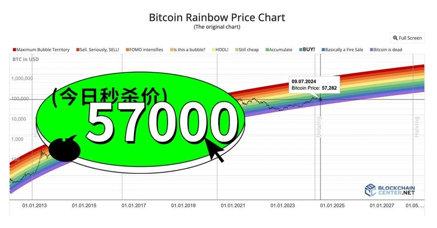 图中一共有 10 个色带,以今天 7 月 9 日为例,BTC 正处在蓝色色带 “特价大甩卖” 的超低价格,适合买入。按照这张图的趋势,未来一个月就算跌破 5 万,也不会触及紫色色带,也就是指标认为“加密结束了”的区间。