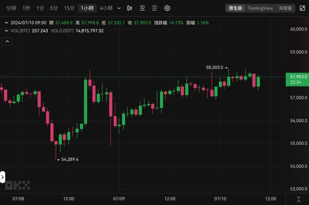近 期在德国政府持续 出售 比特币、Mt. Gox 交易所𫔭始向债权人还款背景下,比特币多次下探。不过昨日 BTC 在震盪中持续向上攀高,今(10)晨多次突破 5.8 万美元,多空交𢧐激烈。