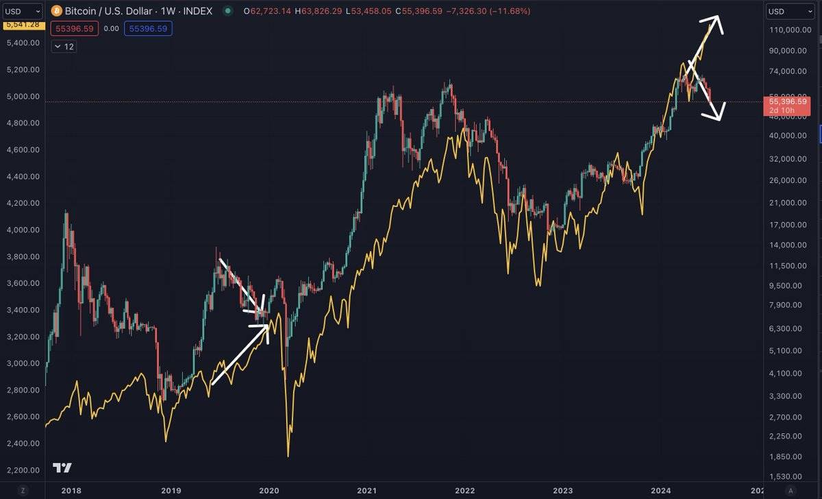 比特币 ($BTC) 与标普 500 ($SPX) 的分歧类似于 2019 年,当时比特币在 6 月达到顶峰。