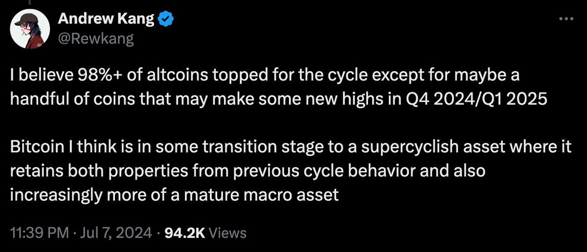 许多山寨币可能已经见顶,但比特币 ($BTC) 可能会进入超级周期。