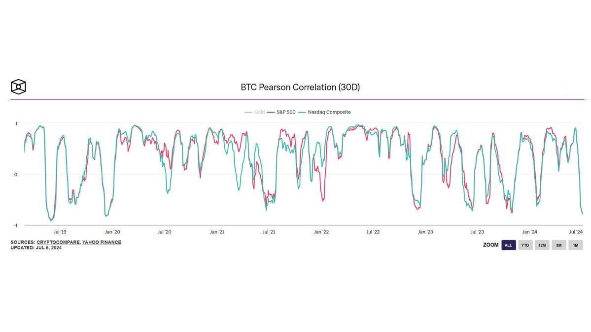 比特币 ($BTC) 与股票的相关性减弱(4.5 年来最低)可能是一个令人担忧的问题。