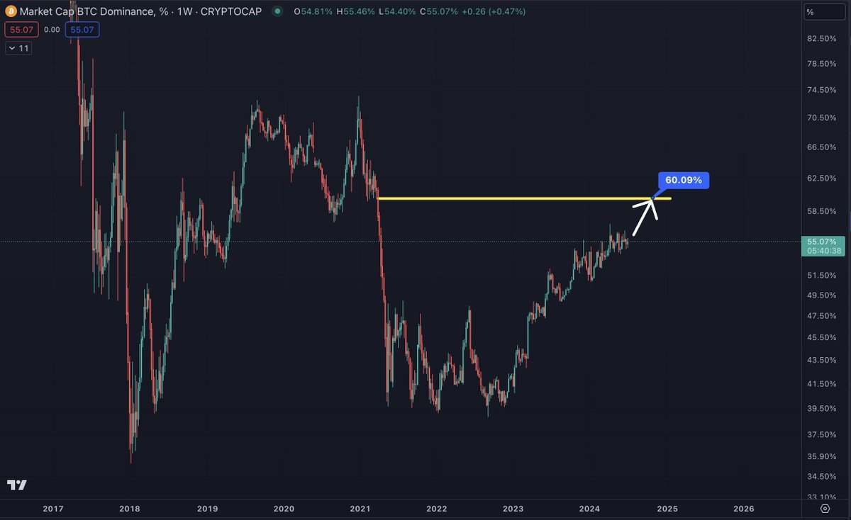 @intocryptoverse 认为比特币主导地位 ($BTC.D) 到 2024 年第四季度可能达到 60% 。