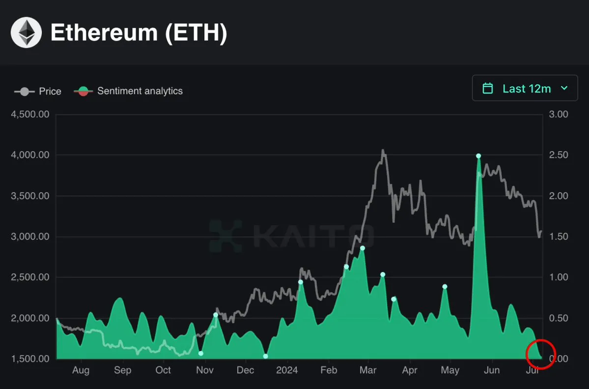 5.潜在的底部信号:ETH 情绪现在处于 2024 年的最低点,接近转负。