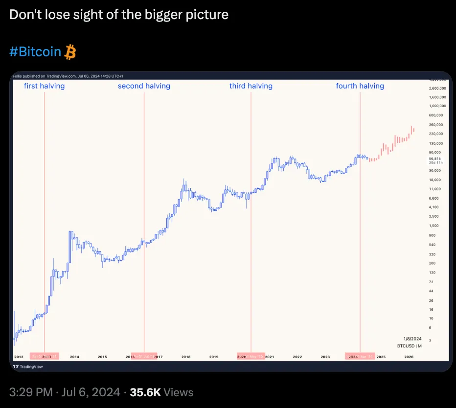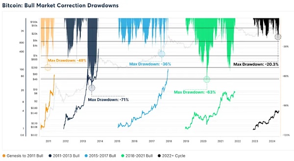 之前的周期中,市场经历了更深的调整。例如, 2016-17 年间的调整幅度在 -25% 到 -35% 之间,而 2020-21 年间的调整幅度则达到了 -50% 到 -63% 。