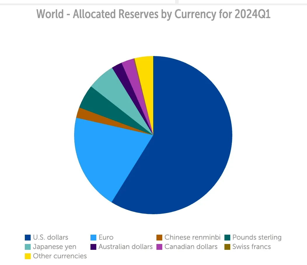 根据国际货币基金组织 2024 年Q1最新数据显示全球货币储备金分配中,美元依旧为全球霸权货币。因此,一切全球经济问题都一定绕不开以美国政治经济为核心的讨论。
