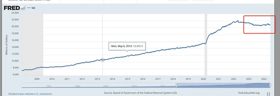 最新数据似乎表现出了较好的美国经济形势。但实际情况是否如此,似乎还需要进一步对比更多的数据内容。比如全美全职就业与兼职就业的数据,兼职就业从新冠疫情以来一直呈现向上的趋势,依旧是说非农数据中可能含有重合性数据。此外,如果我们对比 M 2 数据发现在近年并未有增量资金的出现。