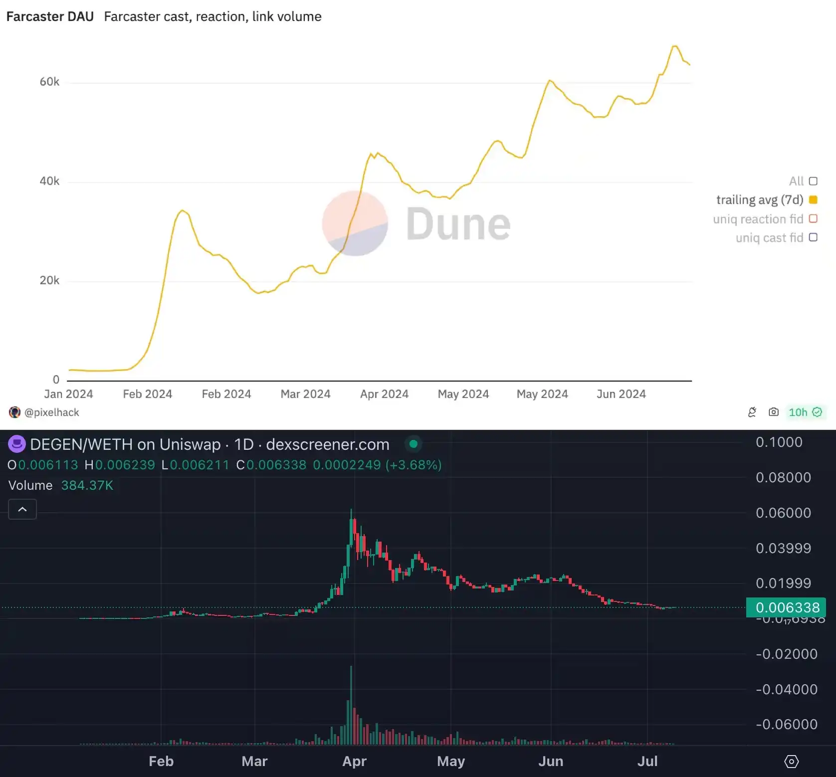 上图:Farcaster DAU;下图:DEGEN 币价走势图|二者呈现正相关性,但后期 DEGEN 币价涨幅与 Farcaster DAU 相关性下降