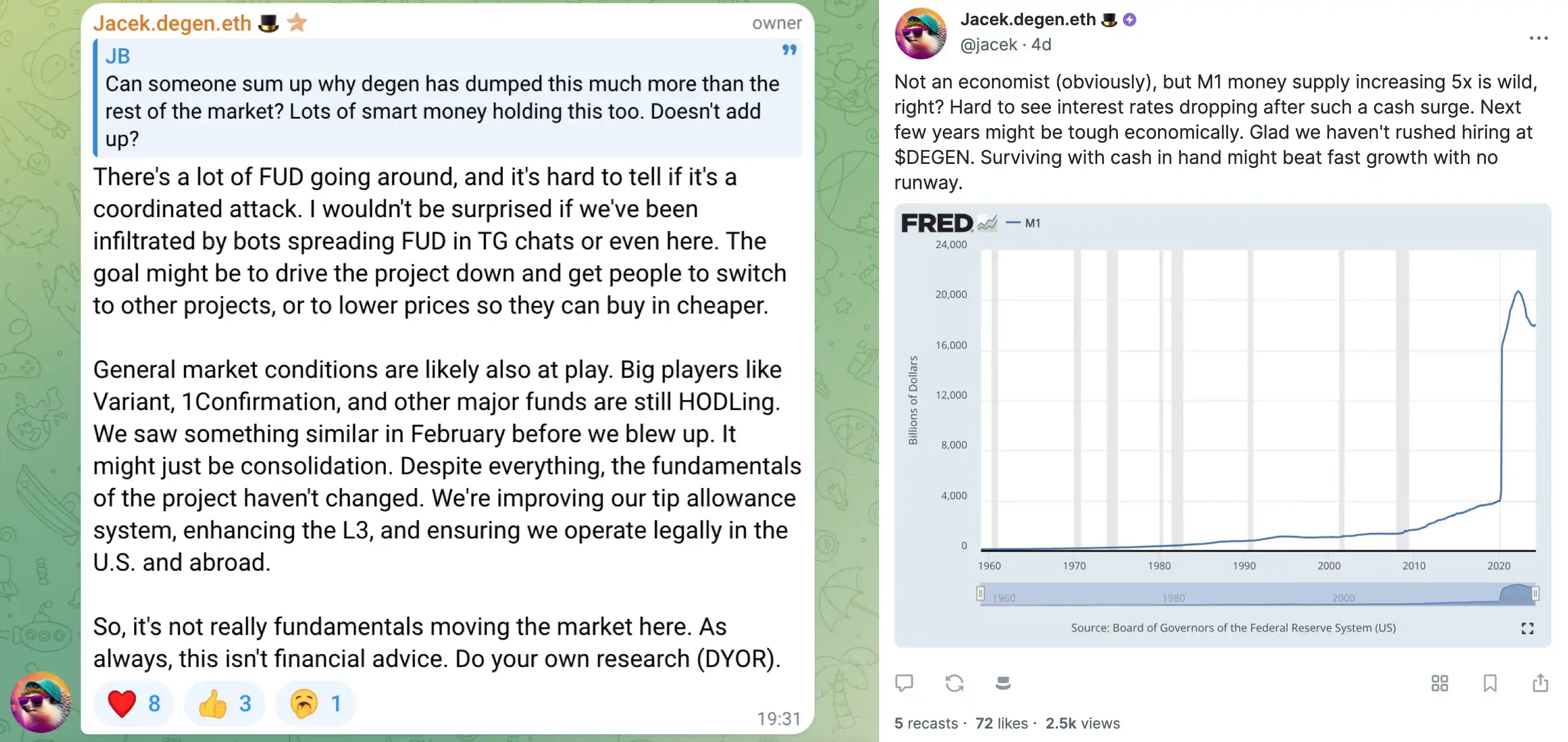 右图:Jacek 在 Warpcast 发帖称「M 1 货币供应量增加了 5 倍,如此大量的现金涌入之后,很难看到利率会下降,接下来的几年经济可能会很艰难。很高兴$DEGEN 没有急于招聘,手头有现金生存可能比没有跑道的快速增长更好。」