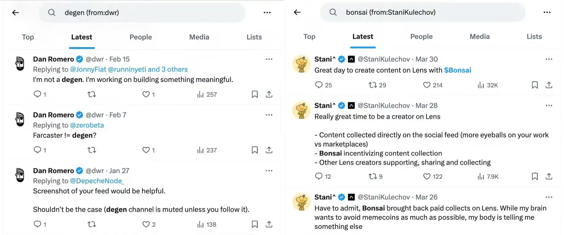 有人在 Dan 的 Twitter 账户搜 DEGEN 以及在另一大去中心化社交协议 Lens 创始人 Stani 的 Twitter 上搜 Lens 生态龙头 meme 币 BONSAI,结果显示 Dan 并没有主动提及 Degen 代币,并且还明确表示 Farcaster 不等于 Degen,另一方 Stani 则直接明牌喊单。