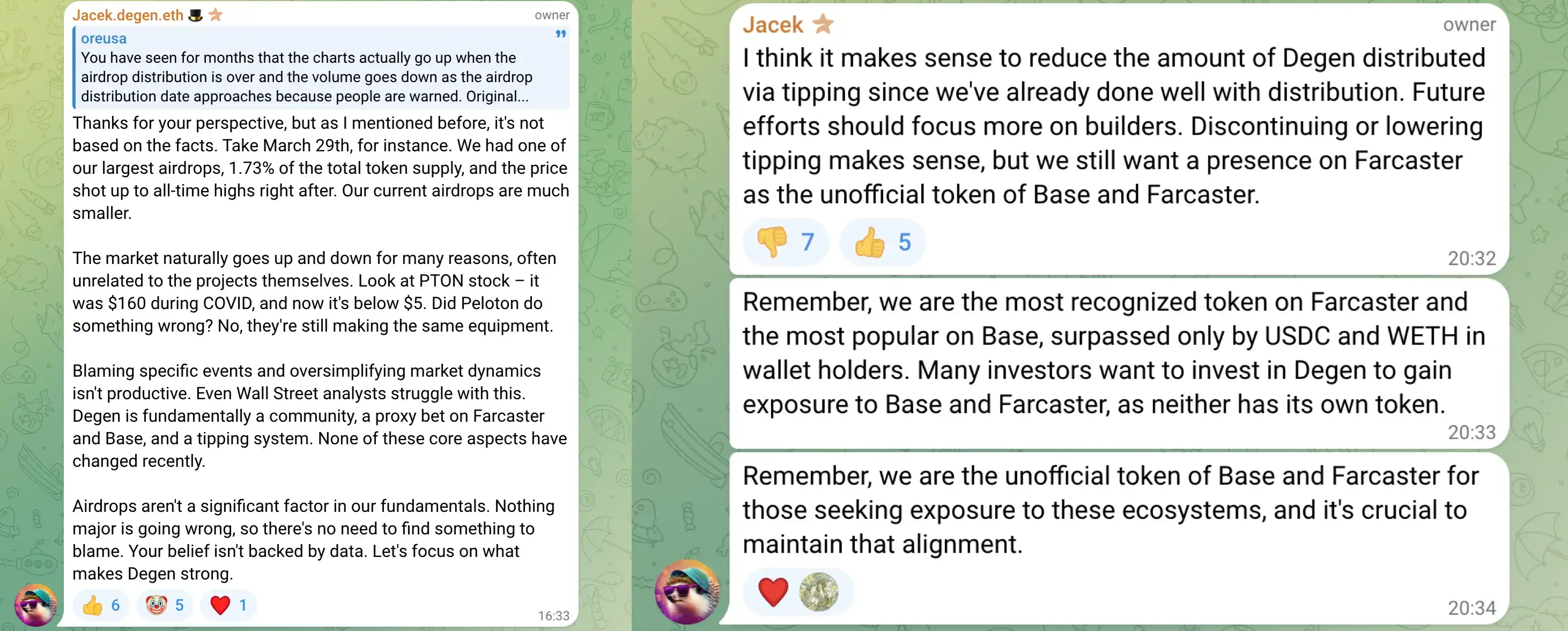 Jacek 在 Telegram 上回复社区用户问题、以及安抚投资者情绪|「将市场动态简化为具体事件并加以指责并没有建设性,即使是华尔街的分析师也很难做到这一点。Degen 本质上是一个社区,一个对 Farcaster 和 Base 的代理赌注,以及一个打赏系统,这些核心方面最近都没有发生变化。」