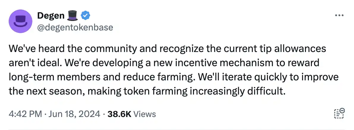 6 月 18 日,Degen 官方发文表示正在开发一种新的激励机制以鼓励长期持有者,「未来的系统将要求用户通过锁定或抵押来展示对 Degen 项目的承诺,旨在奖励长期持有 DEGEN 代币的人」。官方还表示废除提高 PB 用户的打赏额度这一设定,奖励额度根据 DEGEN 持有量来决定。