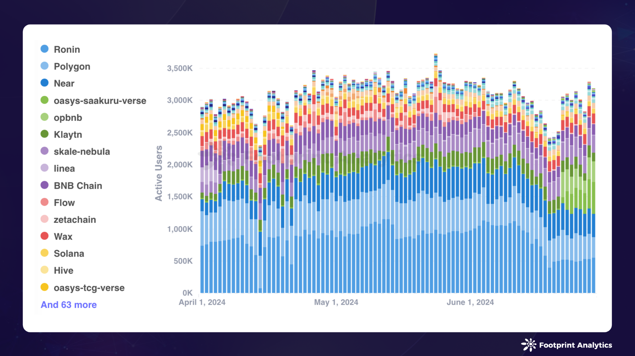同时,在 300 万 DAU 中,Ronin、Polygon 与 NEAR 虽继续领跑,却也面临诸多挑战。Ronin 的 DAU 占比受 Pixels 影响,从月初的 29.8% 滑落至月末的 18.4%。而 Polygon 方面,由于旗下最大 DAU 游戏 Matr1x FIRE 的 DAU 环比下降 31.6%,其 DAU 占比亦从 15.1% 缩减至 8.0%。
