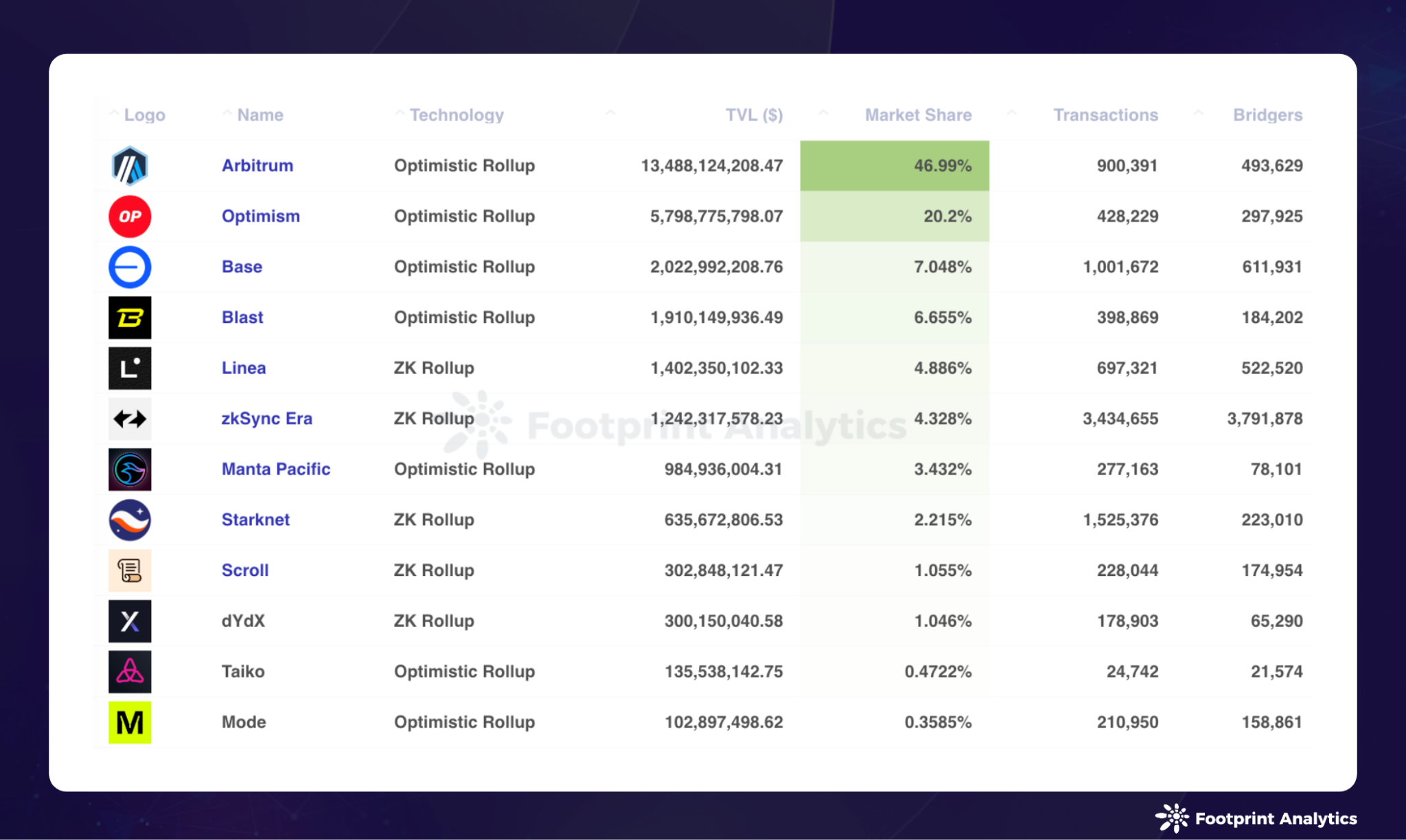 数据来源: 2024 年 6月以太坊 Layer 2 概览 - Rollups (桥接相关指标)