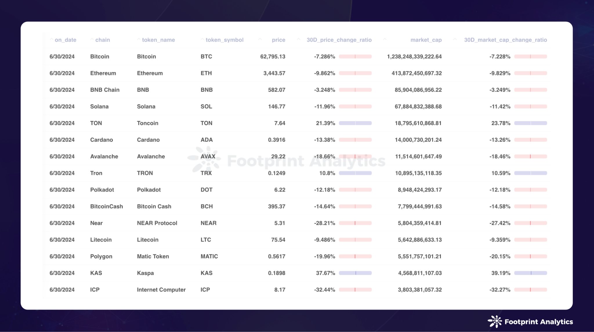数据来源: 2024 年 6 月底公链代币价格和市值