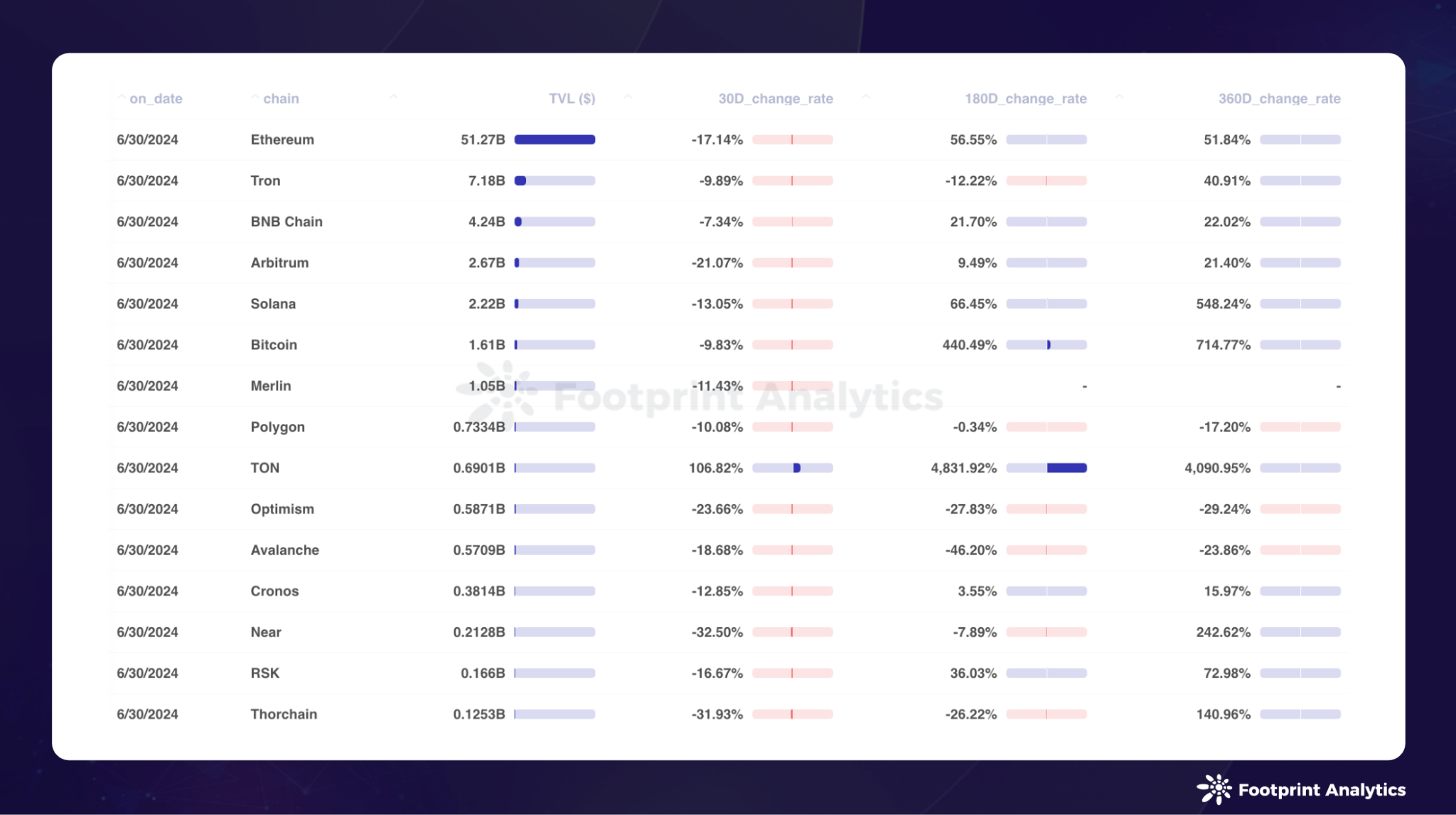 在排名前十五的公链中,只有 TON 的 TVL 实现了增长,并且增长幅度达到了 106.8%,而其他链均有所下降。