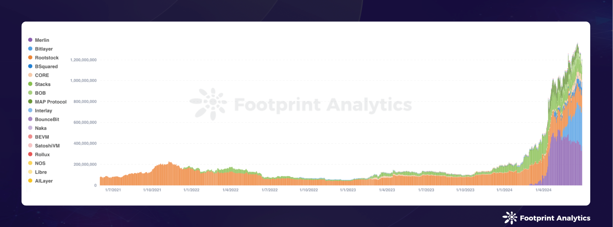 与此同时,比特币扩展解决方案自 2023 年第四季度以来 TVL 激增,其中以 Merlin Chain 、Bitlayer 和 Rootstock 的表现尤为突出。尽管六月市场遭遇了回调,但比特币生态系统却迎来了一个充满活力与创新的夏天。
