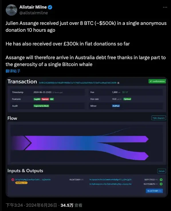 编者按:朱利安·阿桑奇(Julian Assange),维基解密(WikiLeaks)创始人,是近年来最具争议的人物之一。他因揭露全球多国政府的机密文件而闻名,这些文件涉及战争、外交和政治等多个领域。阿桑奇的行动赢得了许多支持者,他们认为他是言论自由和信息透明的捍卫者,但也引来了不少批评和法律纠纷,尤其是来自美国政府的指控。阿桑奇自 2010 年以来一直处于法律纠纷的漩涡中。他在瑞典面临性侵指控,并在英国被捕后为避免引渡到美国而寻求庇护,最终于 2012 年进入厄瓜多尔驻伦敦大使馆。在大使馆内生活了七年后,阿桑奇于 2019 年被英国警方逮捕,并再次面临被引渡到美国的风险。阿桑奇在与美国政府进行了一场漫长的法律斗争后,最近返回澳大利亚。这一回归得益于一笔匿名的比特币捐赠,缓解了阿桑奇的财务压力,同时也引发了关于捐赠者身份的广泛猜测和讨论。