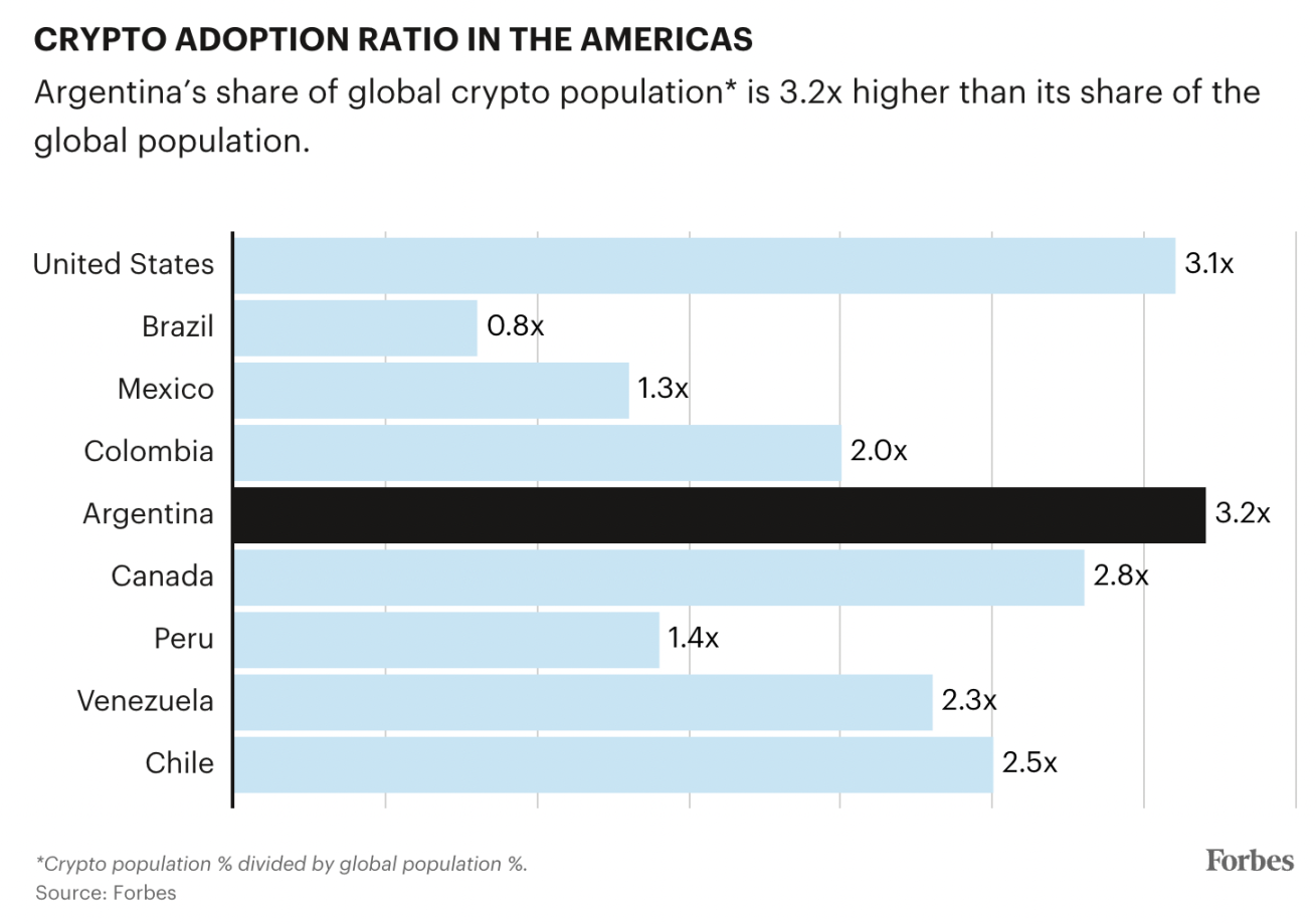 阿根廷的加密货币采用率高于西半球任何其他国家。根据《福布斯》对 Similarweb 网站数据的研究,在全球 55 家最大交易所的 1.3 亿访客中,有 250 万人来自阿根廷。此外,加密数据分析公司 Chainalysis 在去年年底的一份报告中指出,截至 2023 年 7 月,阿根廷「在原始交易量方面领先拉丁美洲,估计交易价值为 854 亿美元」。