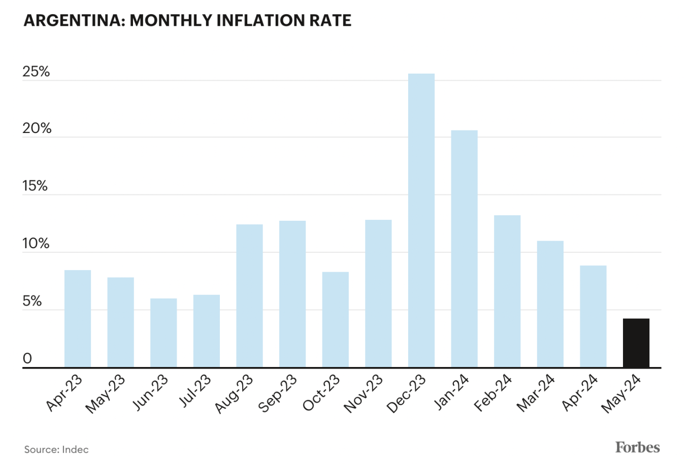 阿根廷为什么会陷入困境?除了拥有 350 万名员工的臃肿公共部门和缺乏对财政紧缩的承诺之外,天气模式(拉尼娜现象)等外部因素对去年和今年的粮食出口(该国的主要硬通货来源)产生了重大影响。阿根廷经历了过去 60 年来最严重的干旱。「大豆、玉米和小麦三种农作物全部歉收是从未发生过的,」该国主要农业交易所的经济研究主管 Julio Calzada 表示。「我们都在等着下雨,」作物减产意味着美元收入减少,从而推高了食品价格,增加了违约风险和利率。米莱在 2023 年 12 月 10 日的就职日演讲中明确表示,他计划结束以前的做法。「这一天,我们埋葬了几十年的失败和毫无意义的斗争,」他说。「没有回头路了。」当时,阿根廷的年化通货膨胀率高达 143%,贸易赤字达 430 亿美元,财政赤字相当于该国国内生产总值的 3.5%。米莱上任六个月后,通货膨胀率仍然居高不下,但该国已连续六个月实现贸易顺差,财政盈余占国内生产总值的 1.1%。
