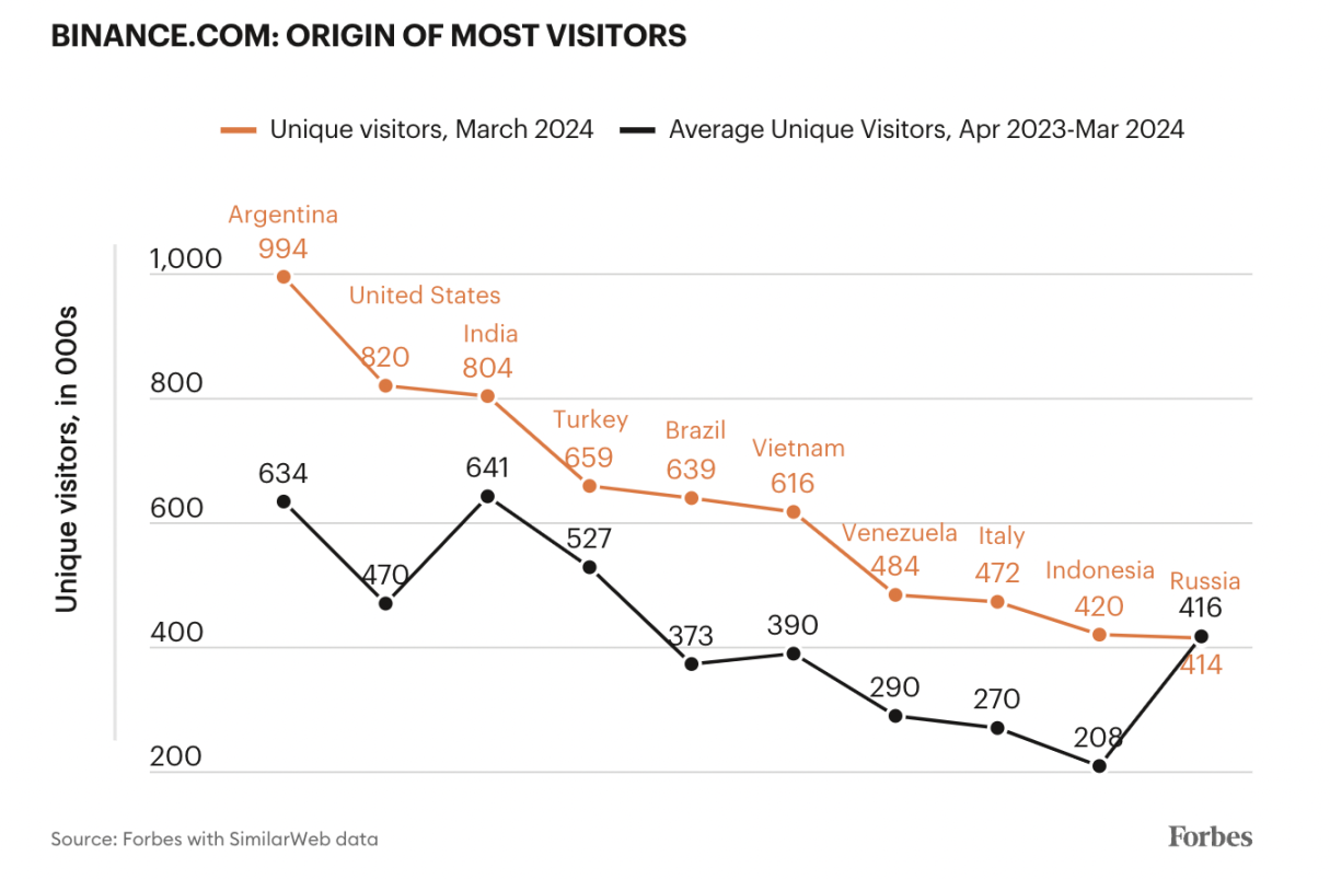风险不止于此,还包括为阿根廷提供服务的交易所和市场。《福布斯》在 5 月份评选出全球最值得信赖的 20 家加密货币交易所,阿根廷排名前五的加密货币提供商——币安、eToro、BingX、HTX 和 Bitget——均未入选,原因是缺乏国内监管监督。币安是访问量最大的交易所网站,来自阿根廷的流量超过任何其他国家。但币安甚至没有一个国家监管机构监管,更不用说本地监管机构了。