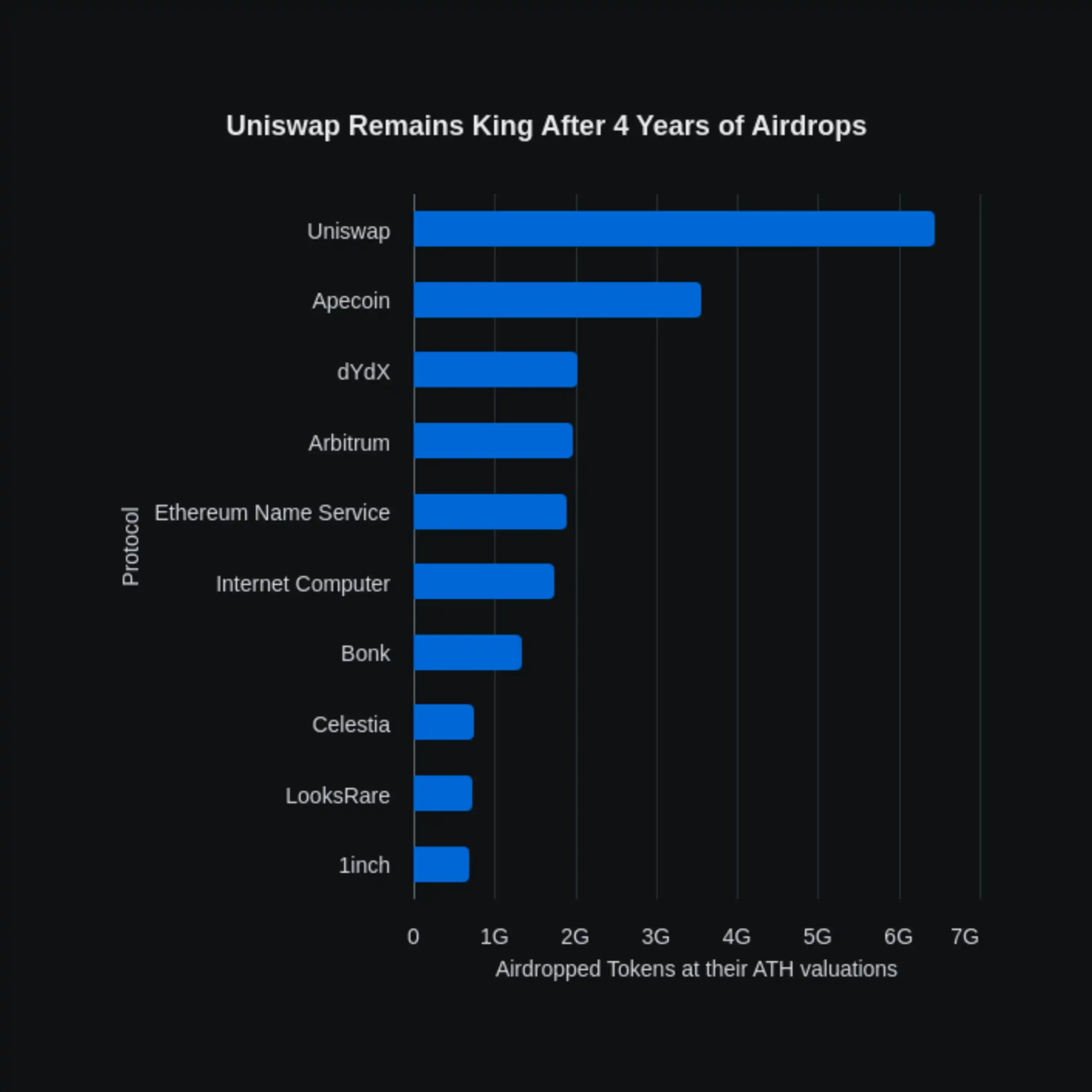 Uniswap 空投标志着 Web3 市场的关键时刻,即使已经过去四年,它仍然是有史以来最大的空投,在巅峰时期价值达到惊人的 64 亿 B。