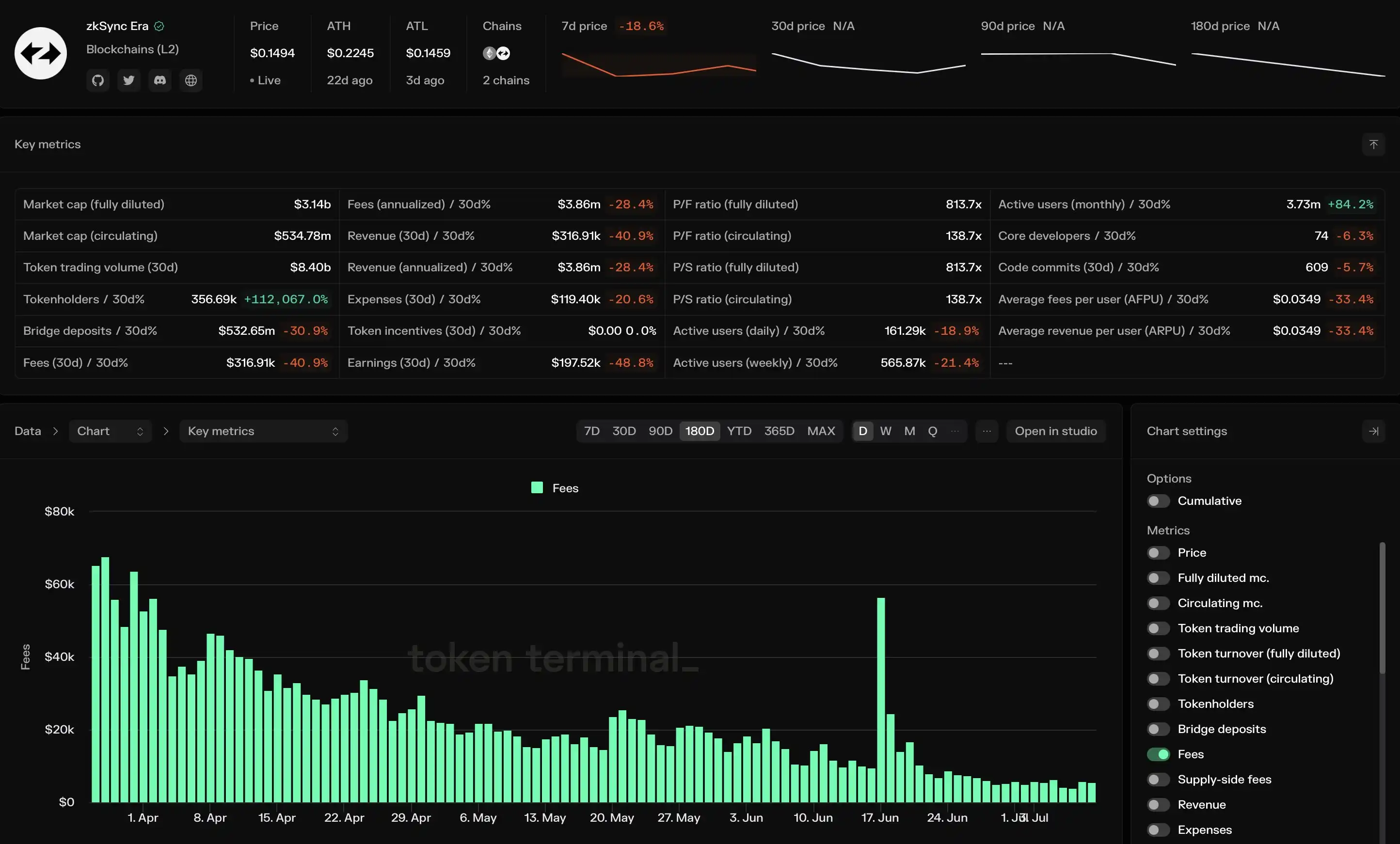 在 $ZK 空投之前,zkSync 产生的每日费用与 Arbitrum 相当。然而,自快照公告和代币分发以来,这个数字一直在下降。最近,自 zkSync Era 推出以来,每日费用首次跌破 1 万美元。
