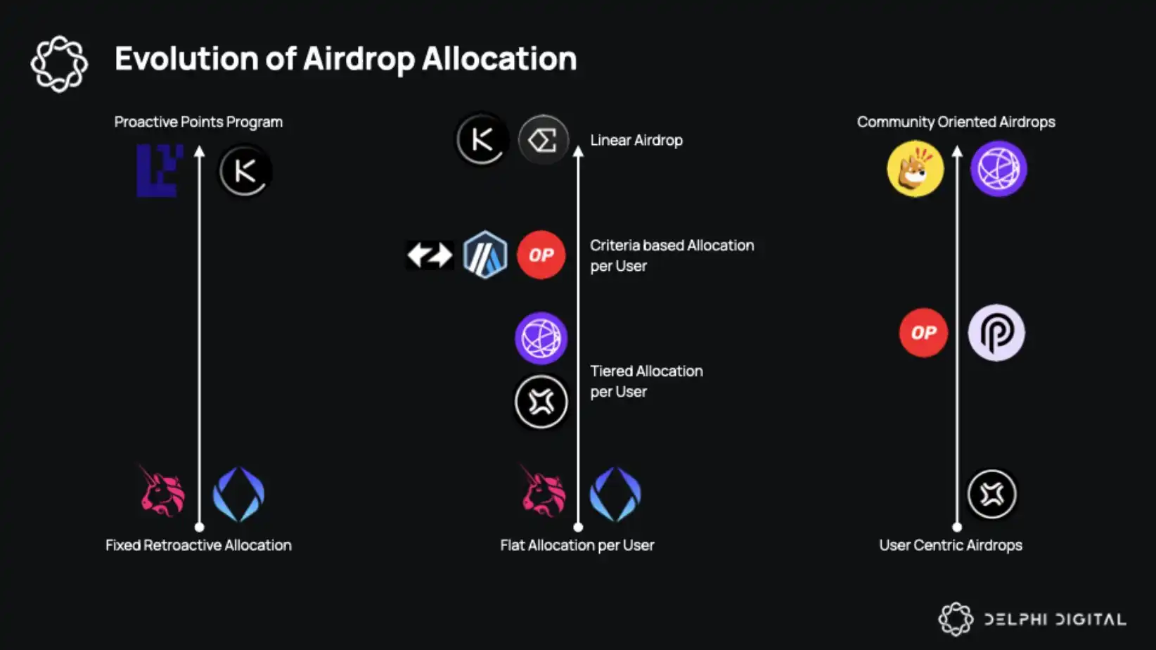 最初,使用固定奖励系统(Uniswap)。然后,出现了分层空投(Jito)。Optimism 团队推广了多种基于标准的空投。现在,我们有了积分系统。