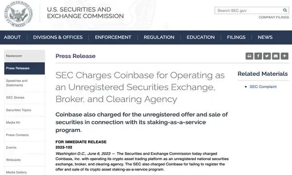 6 月 6 日,SEC 起诉 Coinbase,指控其在未经注册的情况下非法经营加密资产证券业务。