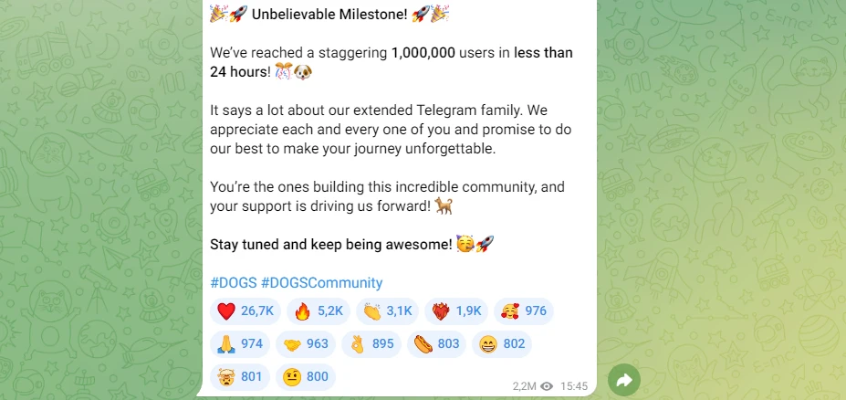 在蓬勃发展的 TON 生态的推动下,DOGS 项目迎合了当前生态中缺乏代表性 Meme 形象的需求。通过向 Telegram 用户空投代币,仅在短短一天内便吸引了超过 100 万订阅用户,且每天内容阅读量超百万,其增长速度惊人。