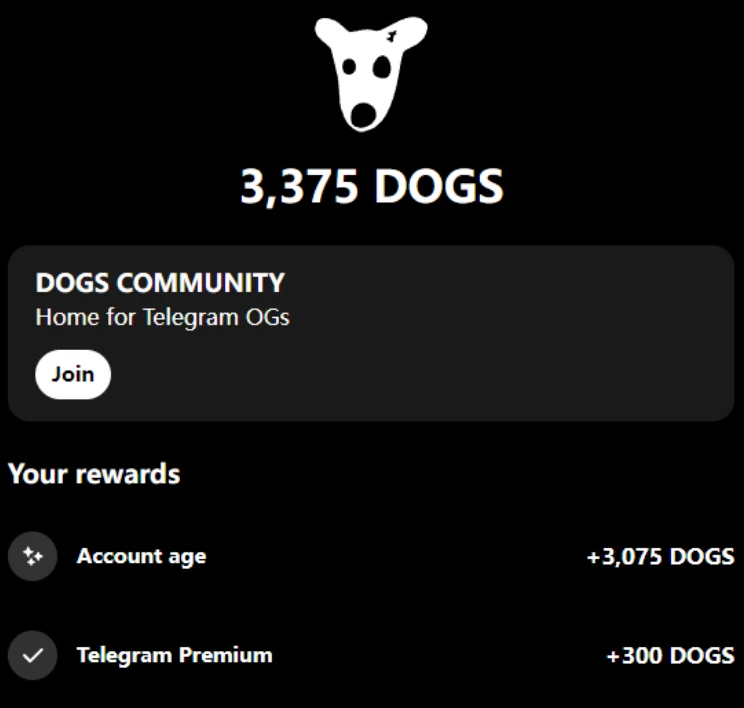 DOGS 昨日在各大社交媒体中刷屏的原因是因为其参与并领取代币积分的方式非常简单:用户只需进入 Telegram 中的 DOGS BOT 频道,系统会根据用户的 Telegram 账号注册时间和活跃度进行评级,并据此分发积分。此外,开通了 Telegram Premium 账号的用户还能获得额外的积分奖励。 目前仍为领取 DOGS 代币积分的用户 可点击此处跳转 。