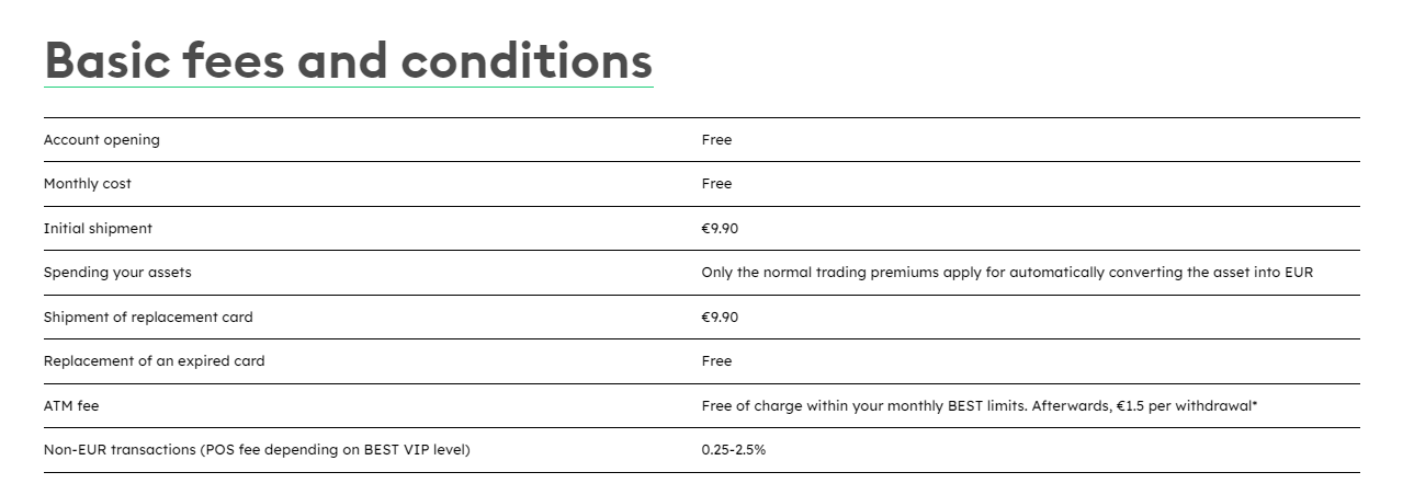 Bitpanda:主要在欧洲市场运营,提供欧元加密信用卡。其整体费率较低,非欧元区的费率为 0.25% 至 2.5% ,邮寄费用为 9.9 欧元。Bitpanda 的独特之处在于其与 Amazon、XPremium、Expedia 和 Airbnb 等平台的合作,提供丰富的返利选项。