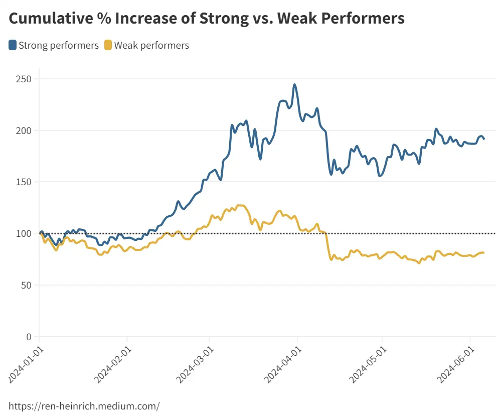 我们可以看到,表现强劲的币种在三月初(3 月 13 日,平均+ 104% )的涨幅显著高于表现平平的币种(3 月 13 日,平均+ 27% ),并且能够长期保持这种优势。