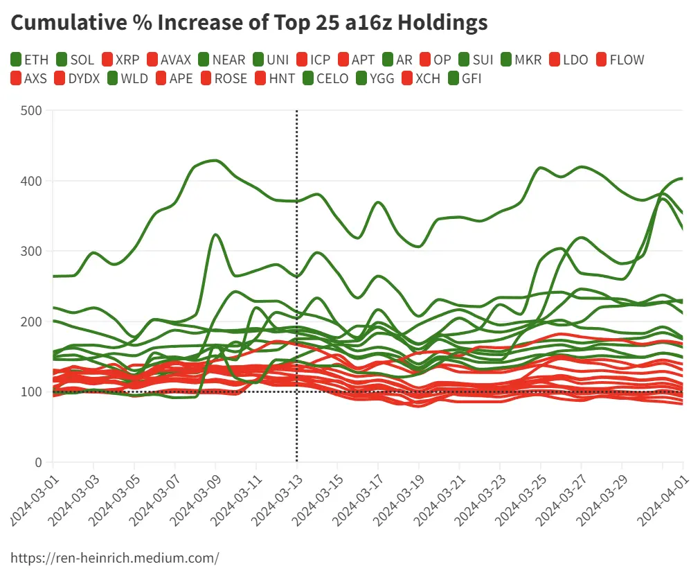 Andreessen Horowitz (a16z) 是世界上最著名的风险投资公司之一。 他们的投资组合包含大约 50 种加密货币。在这个分析中,我想看看作为散户投资者,如果你进行跟单交易,即投资与a16z相同的币,并在大约 5 个月后将其出售,你是否可以在 2024 年获利。