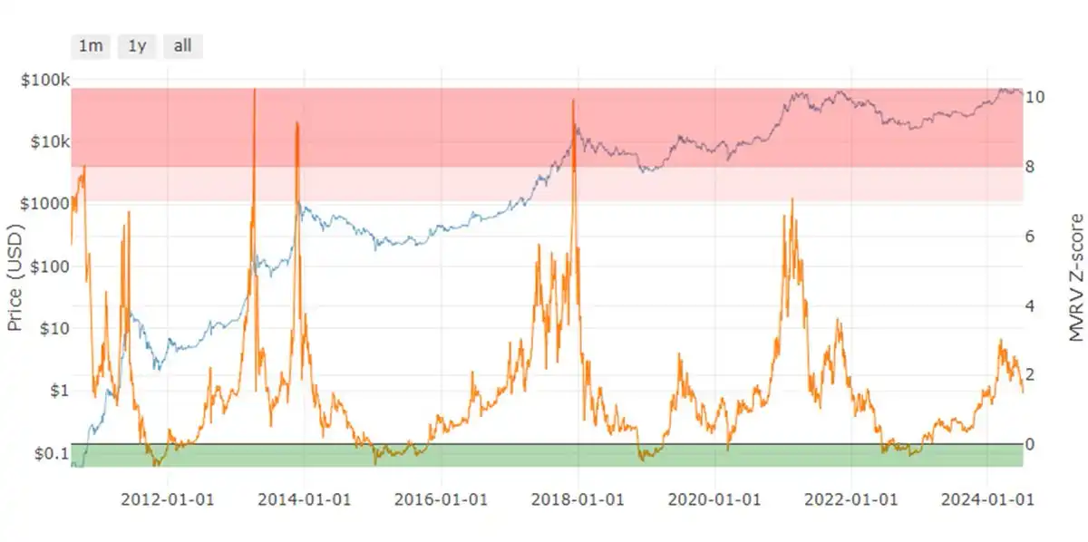 随着市场中的大量杠杆被清除,当前的低 MVRV 值暗示市场有进一步上升的潜力。历史数据显示,当比率超过 4 时,往往是卖出的信号;而低于 1 时,则是买入的好时机。因此,从这个角度来看,比特币未来还有很大的上升空间。