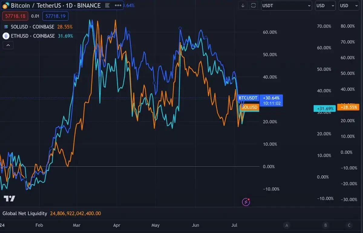 专注于流动性的机构 crossbordercap,已经呼吁将 2024 年下半年的流动性增长率提高到 20% 。此外,瑞典和欧洲央行也表示将开始放松货币政策。这样的政策变化,将为市场注入更多的资金,推动风险资产价格上涨。