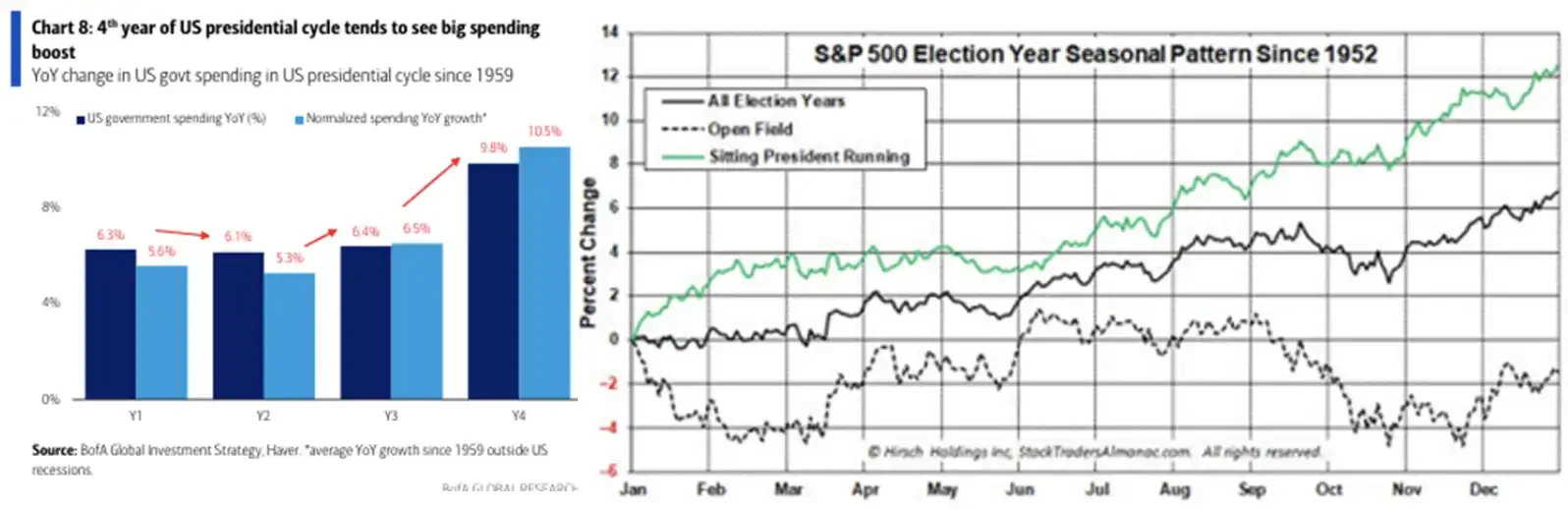 选举周期对市场的影响同样不容忽视。每逢选举年,政府的支出往往会增加,这对市场来说也是一个积极信号。特别是现任政府在竞选期间通常会加大直接和间接的支出,这通常会导致年初市场表现强劲,夏季稍显平静,而到了下半年市场会再次反弹。2024 年的选举周期也不例外,预计下半年市场将表现出色。