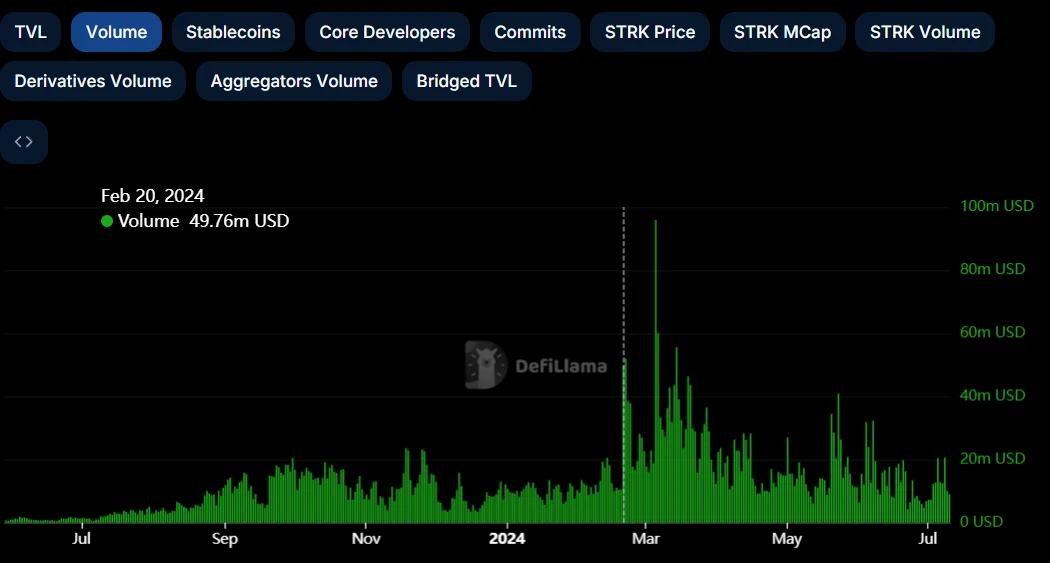 根据Defillama的数据,Starknet网络日交易量在空投前后并无明显变化,空投结束后并未影响用户在Starknet网络上交易的热情。