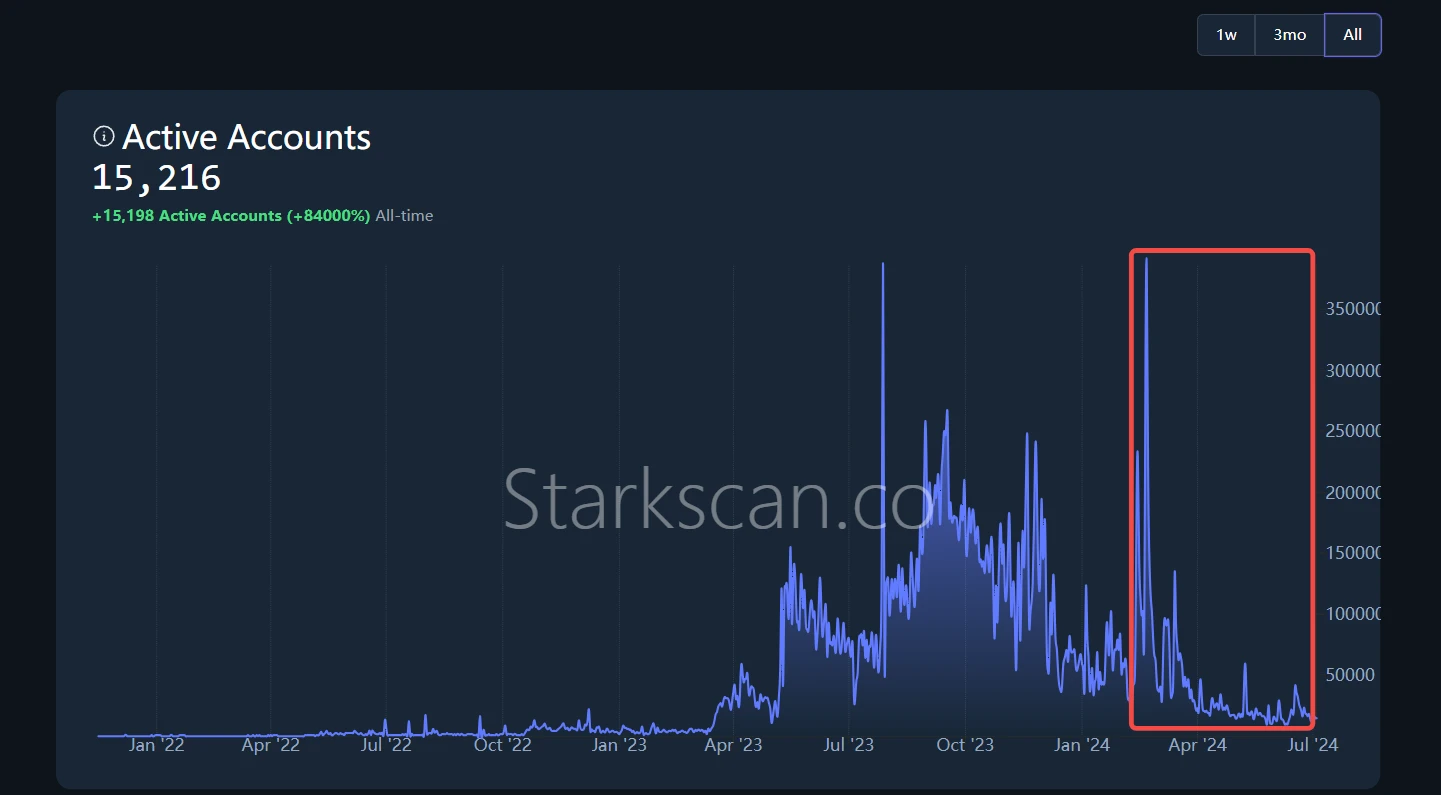 2023年5月至2024年2月宣布空投前这段时间,Starknet网络日活跃地址数平均约为10万,而目前来看空投申领结束后日活跃地址数已经减少了约80%。