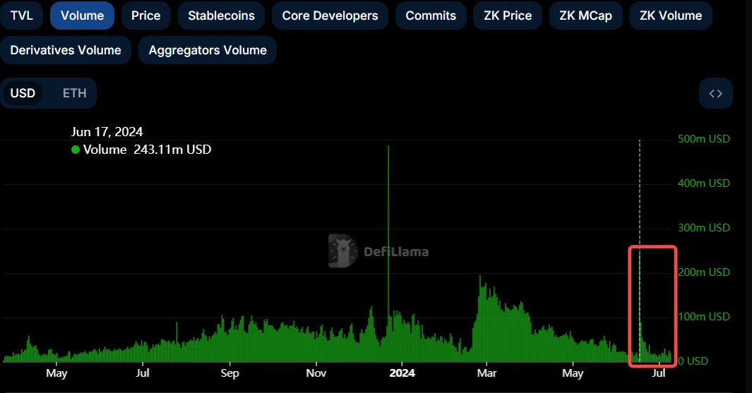 根据Defillama的数据,因为领取空投的需求,6月17日ZKsync Era网络交易量达到了2.4亿美元,创下2024年最高记录。但当空投领取完后,日交易量迅速回归平均水平,也无明显下跌。
