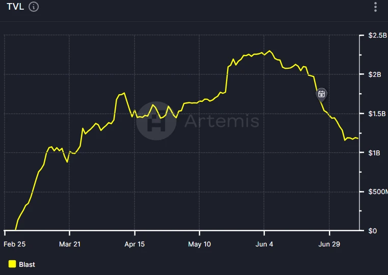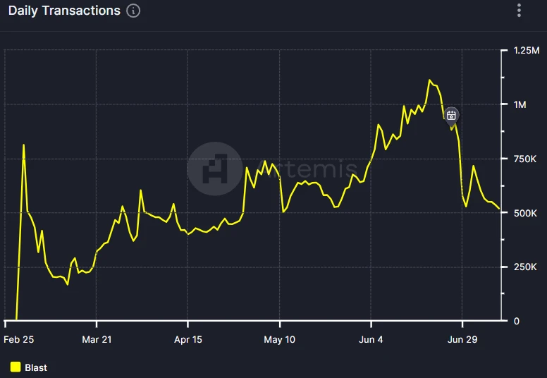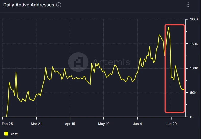 根据Artemis的数据,6月份Blast的日活跃地址数整体处于上升趋势,表明用户对于Blast的信心实际在增加。但当6月26日空投落地,日活跃地址数骤降,短短几天回到了3月份时的水平,并且这种下降趋势仍在继续。