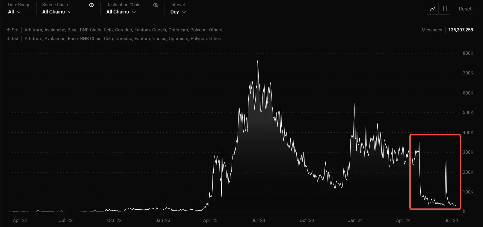 根据LayerZero官方浏览器layerzeroscan数据,使用LayerZero跨链的总消息数在官方宣布快照后也经历了断崖式下跌,除了在6月20日空投领取当日数据有起色外,与空投前相比,平均减少约80%以上,回到了2023年3月的水平。