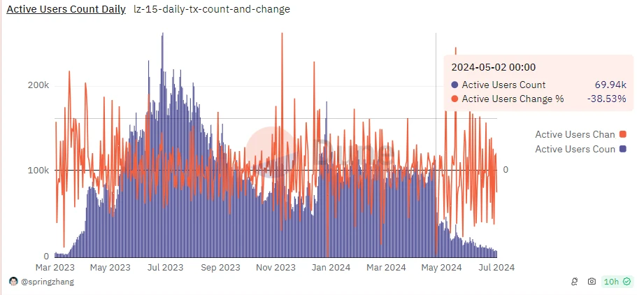 据Dune数据,自LayerZero在5月份初宣布完成快照后,链上活跃地址数断崖式下降,5月2日前链上活跃地址数还有超11万,5月2日后直接减少约40%,随后更是逐渐走向新低,较宣布快照前减少约85%以上。