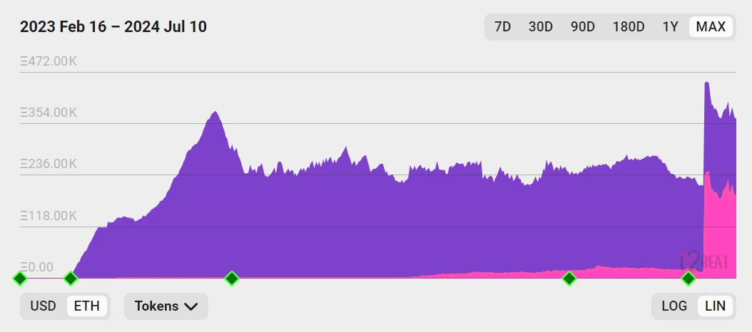 但是根据L2beat的数据,以币本位计算,ZKsync Era网络空投后的TVL下降趋势并不明显。可见,其TVL降低受空投的影响并不大,而可能受其他因素(如整体赛道行情、币价、生态建设等)影响较大一些。