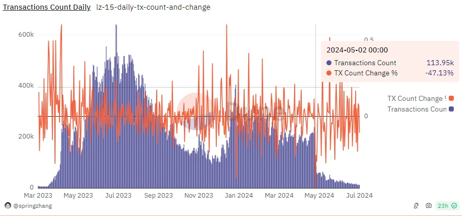 同时,使用LayerZero的日交易笔数在宣布快照结束当天也下跌约47%,空投后日交易笔数平均保持在2万左右,与空投前平均20万的日交易笔数相比,也减少了90%以上。