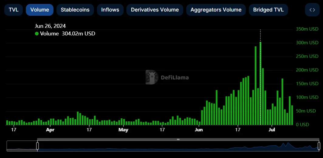 根据Defillama的数据,6月份Blast网络的交易量呈上升趋势,6月26日因空投领取达到历史最高,但很快回到了空投前6月份平均水平。
