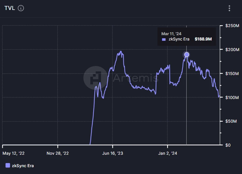 根据Artemis的数据,ZKsync Era网络的TVL以U本位计算在今年3月份未开始空投前就已经呈现下跌趋势,6月份空投之后TVL仍在持续下跌。
