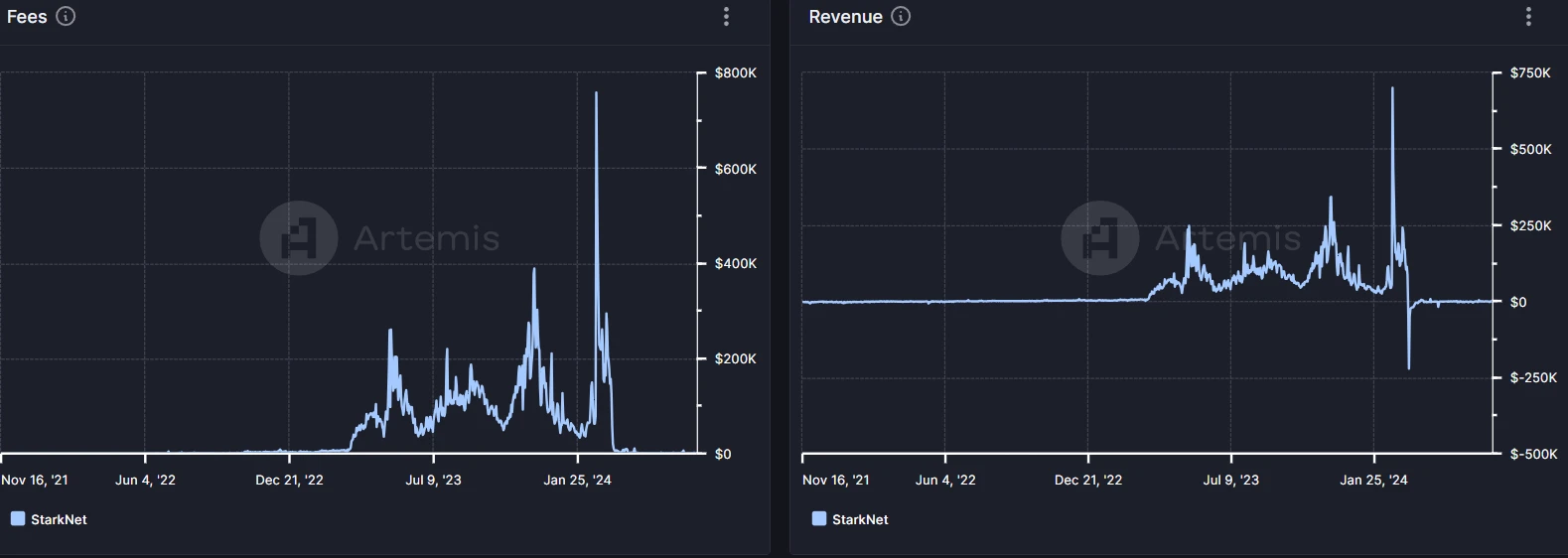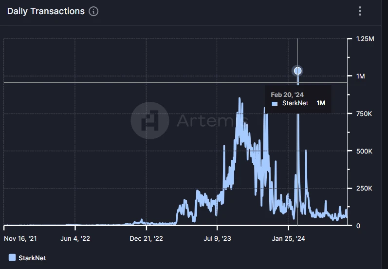 但日交易笔数却呈断崖式下跌。根据Artemis的数据,2月20日空投当日Starknet网络日交易笔数创新高,但之后总体呈下跌趋势,远不如空投前水平。